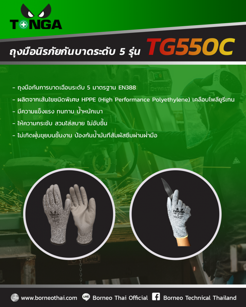 TONGA ถุงมือนิรภัยกันบาดระดับ 5 รุ่น TG550C‘ถุงมือกันบาดเส้นใยชนิดพิเศษ’ HPPE (HPPE – High Performance Polyethylene) เคลือบโพลียูรีเทน และถักจากเส้นใยชนิดพิเศษ HPPE ที่บอกได้คำเดียวเลยว่า แข็งแรง น้ำหนักเบา ช่วยป้องกันการบาดเฉือนระดับ 5 ได้รับมาตรฐาน EN388 กระชับ สวมใส่สบาย ไม่เกิดฝุ่นขุย ไม่อับชื้น ป้องกันน้ำมันที่สัมผัสซึมผ่านฝ่ามือ