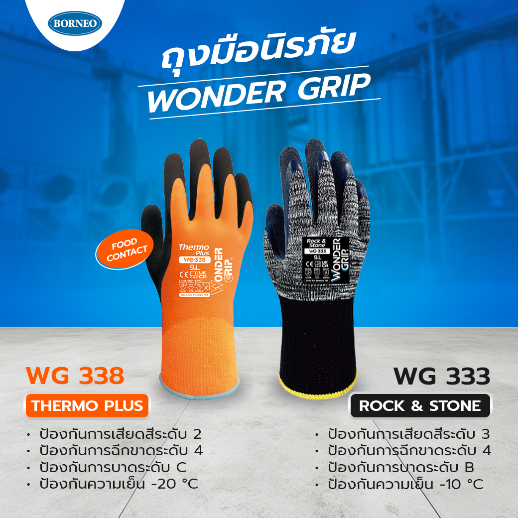 This is why you should choose the Wonder Grip WG-333 and WG-338 safety gloves — designed for professionals who require all-around protection against temperature, abrasion, and impact. Certified with reliable international safety standards, these gloves help you perform at your best every single day.