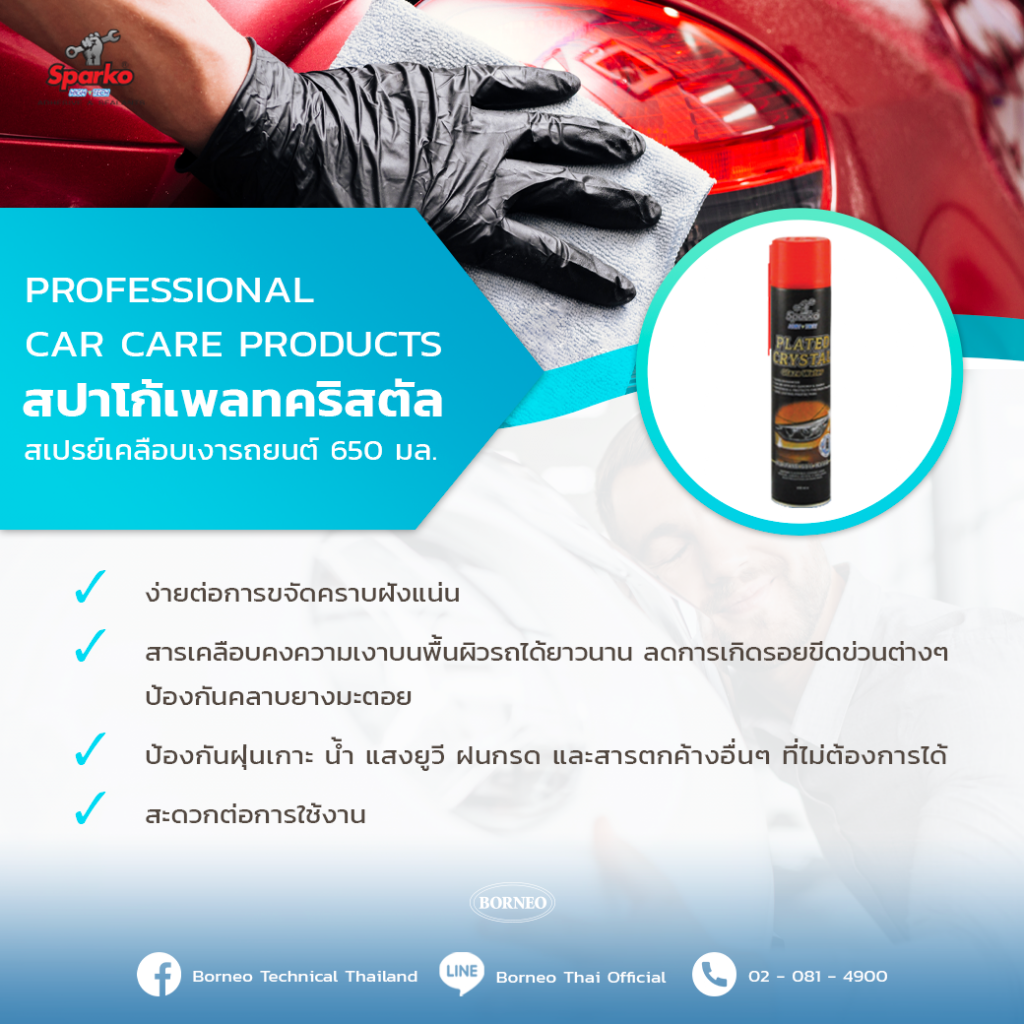 ‘สปาร์คโก้เพลทคริสตัล สเปรย์เคลือบเงารถยนต์ 650 มล.’ สูตรพิเศษสำหรับปกป้องสีและเคลือบเงารถยนต์ ง่ายต่อการขจัดคราบฝังแน่นและสิ่งสกปรกพื้นผิวรถยนต์ ซึ่งสารเคลือบจะสามารถคงความงามบนพื้นผิวรถได้ยาวนาน ลดการเกิดรอยขีดข่วนต่างๆ ป้องกันคราบยางมะตอย รวมถึงสามารถป้องกันฝุ่นเกาะ น้ำ แสงยูวี ฝนกรด และสารตกค้างอื่นๆ ที่ไม่ต้องการได้ ทั้งยังสะดวกต่อการใช้งานอีกด้วย