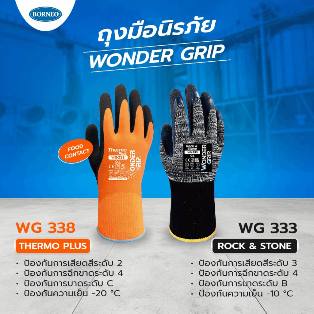 และนี่คือเหตุผลที่คุณควรเลือก ถุงมือนิรภัย Wonder Grip WG-333 และ WG-338 ถุงมือสำหรับมืออาชีพที่ต้องการการปกป้องรอบด้าน ทั้งจากอุณหภูมิ แรงเสียดสี และแรงกระแทก พร้อมมาตรฐานความปลอดภัยระดับสากลที่เชื่อถือได้ ให้คุณทำงานได้เต็มประสิทธิภาพในทุกวัน